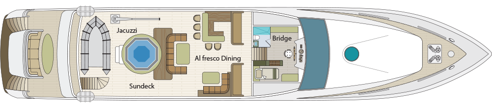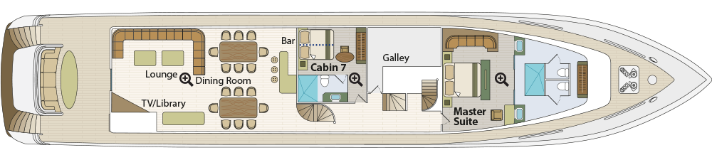 Main Deck: 1 Stateroom,1 Master Suite with his and her bathrooms